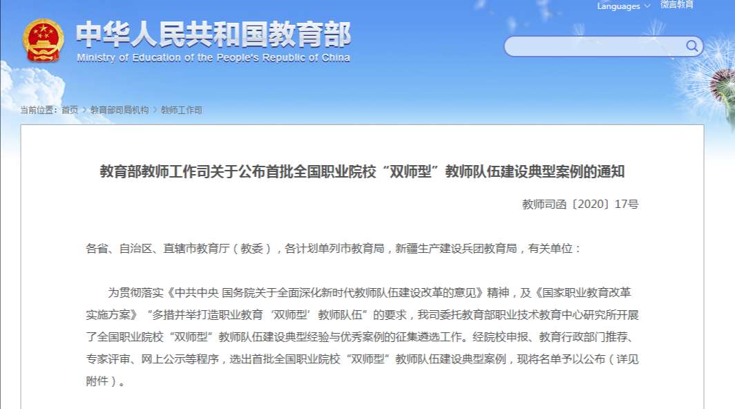 此次典型案例遴选工作由教育部教师工作司委托教育部职业技术教育中心研究所具体负责,于2019年5月启动。征集案例分为职业院校“双师型”教师队伍建设典型案例和“双师型”教师个人专业发展典型案例选出2019年度全国职业院校“双师型”教师队伍建设典型案例(中等职业学校)100个,其中湖北省共有14个案例入选。