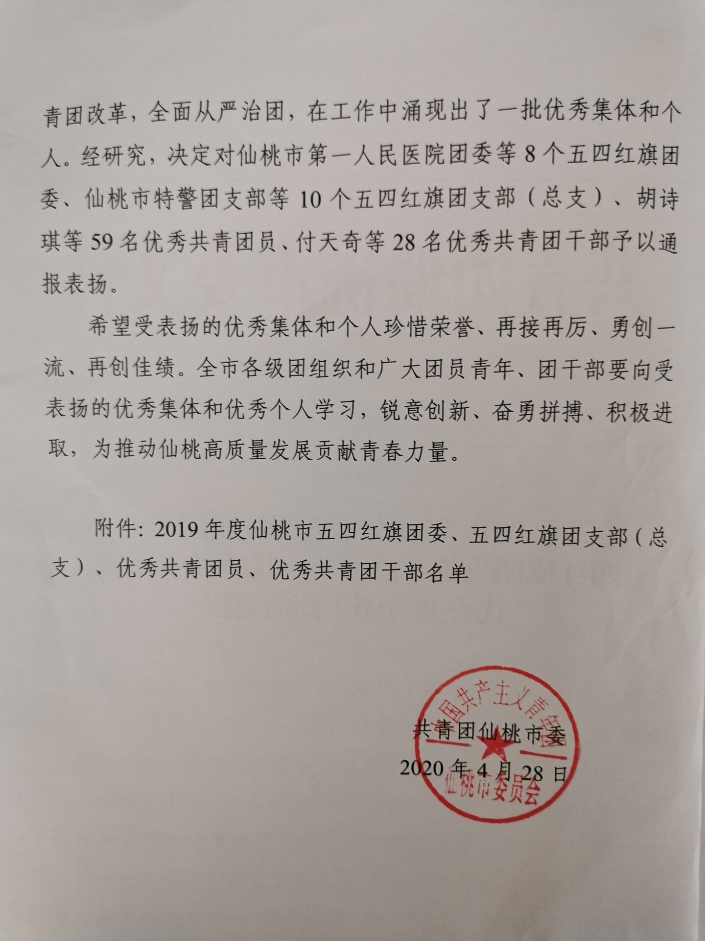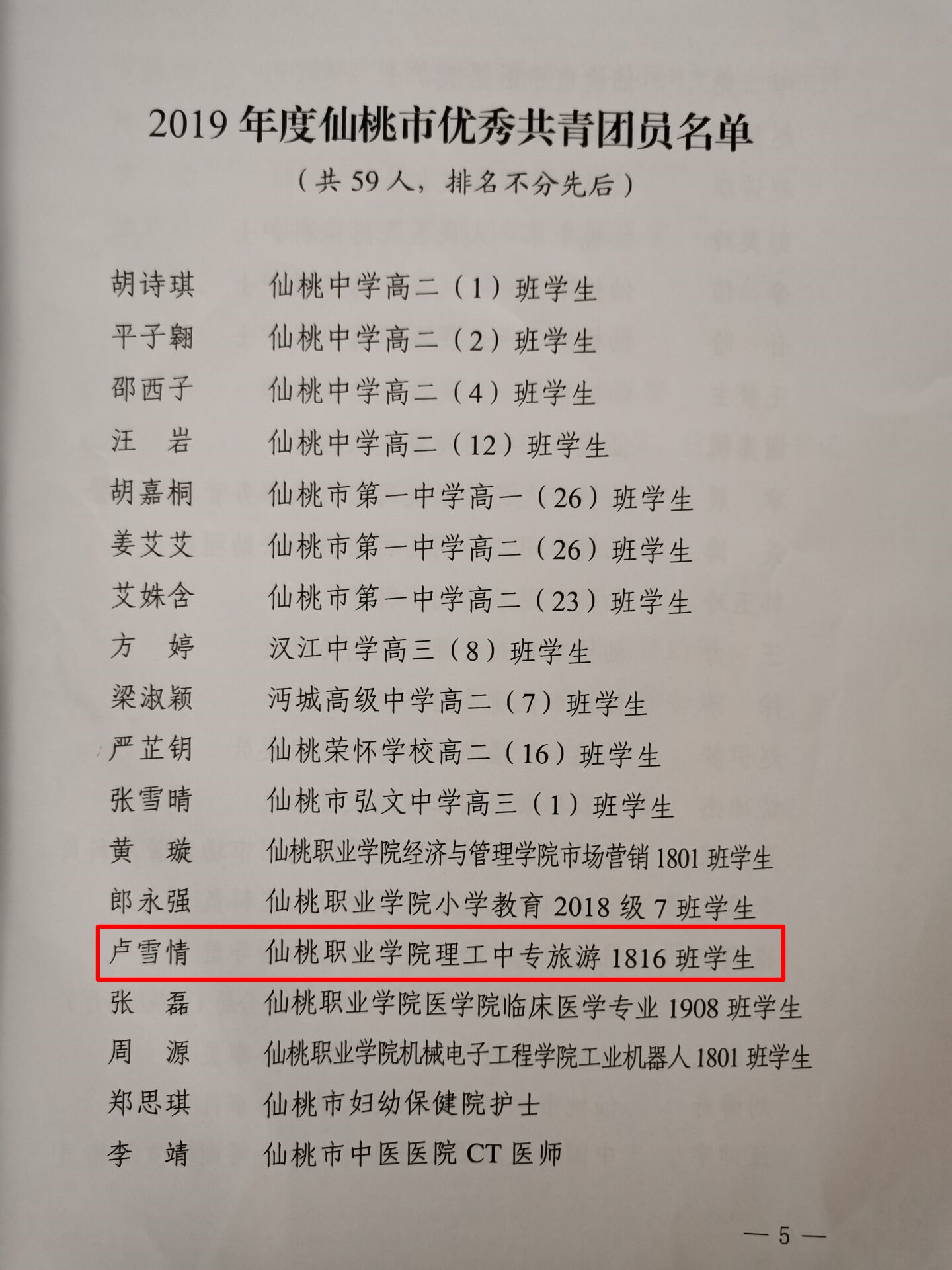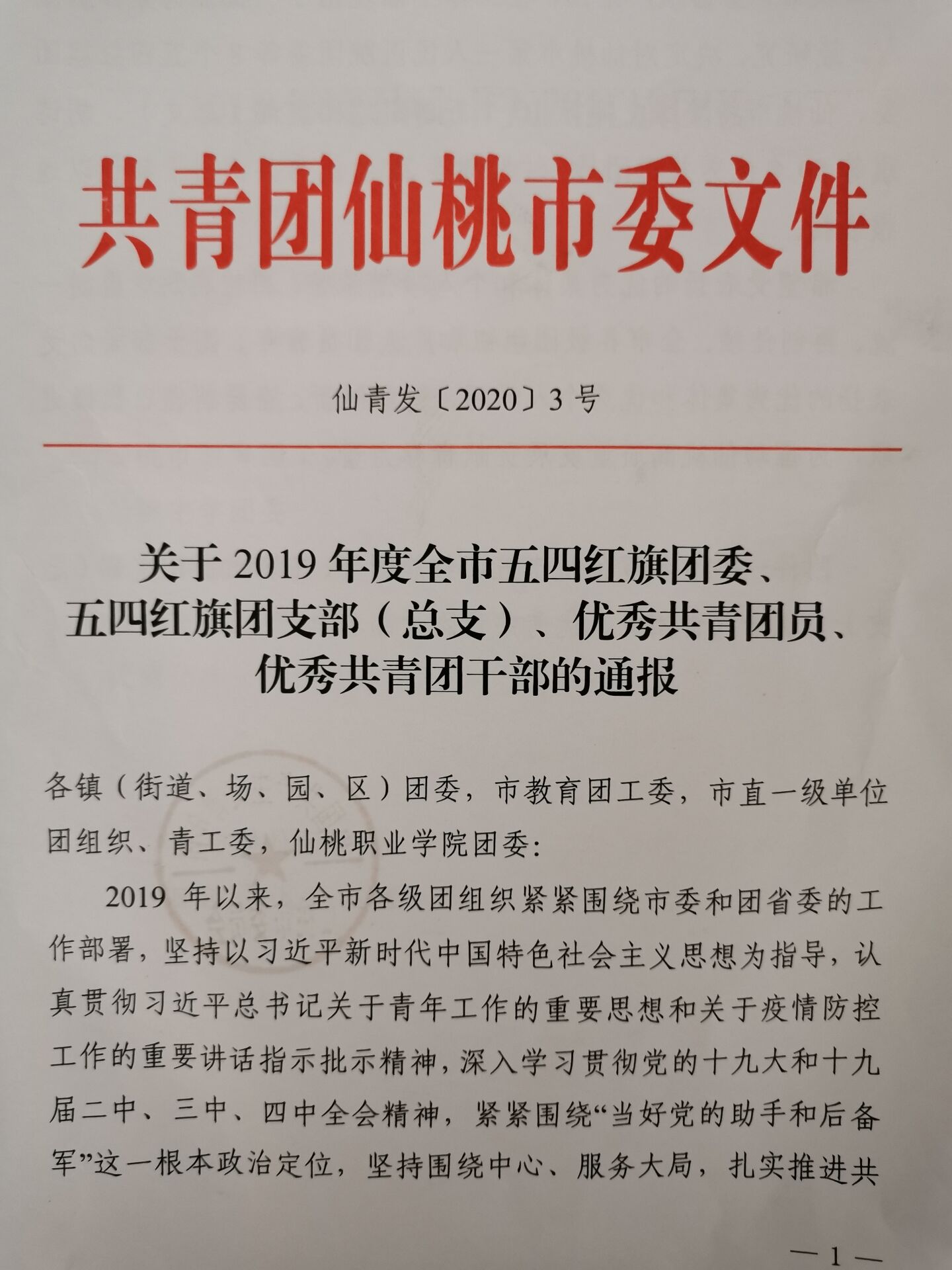 近日,共青团仙桃市委下发了关于2019年度全市五四红旗团委、五四红旗团支部(总支)、优秀共青团员、优秀共青团干部的通报。我校旅游与服务管理专业1816班学生卢雪情荣获2019年度仙桃市“优秀共青团员”称号!