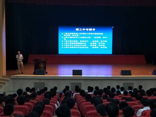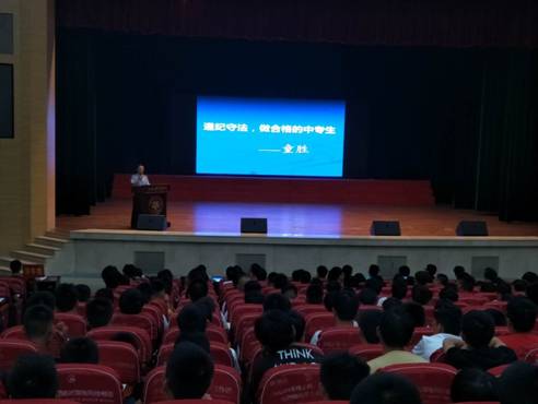 近日,在文化艺术中心,理工中专组织2018级新生参加安全法制讲座,法制讲座分男生专场和女生专场。常驻学院童盛警官给同学们作了主题为《遵纪守法,做合格的中专生》的讲座,讲座中,童盛警官对各种违法行为进行分析,告诫同学们违反法律的严重性,希望同学们在学校好好学习,做一名合格的中职生,保卫科科长张三明向同学们讲解了《理工中专六大禁令》。