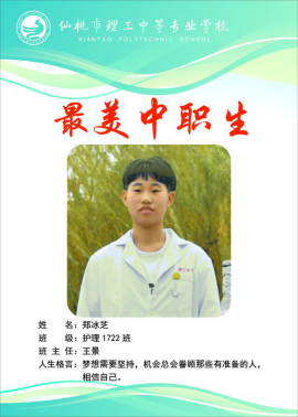 郑冰芝是来自理工中专护理专业1722班的学生,她的性格开朗热情,思想积极向上,学习勤奋努力,在班上能团结同学,热爱集体,课外能积极参加学校的各项活动,为班级争光。