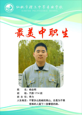 杨业明是仙桃市理工中专汽修1714班的学生,他思想纯朴,乐于助人,刻苦学习,品学兼优。在老师的教育和自己的努力下,不断进步,多次获得各种荣誉和表彰,成长为一名个性鲜明、全面发展的优秀学生。