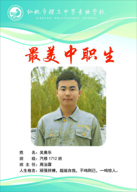 吴奥乐,来自汽修1712班。在班里他担任团支书一职,做事兢兢业业,受到了大家的好评。在学校活动中吴奥乐能吃苦耐劳,班级有什么活动他总是能跑在最前面积极参与。在学习上吴奥乐认真刻苦,能围绕着老师的指引去学习。在实训上能做到动手动脑,按照老师的方法来办事。