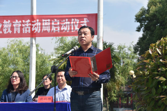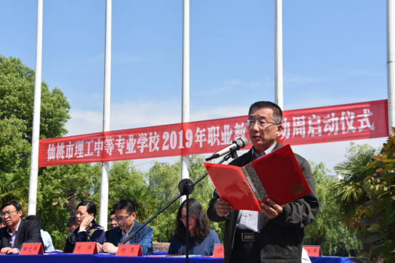 理工中专党总支书记、校长饶剑辉辉宣读《仙桃市理工中等专业学校2019年职业教育活动周实施方案》