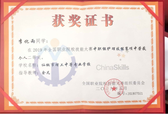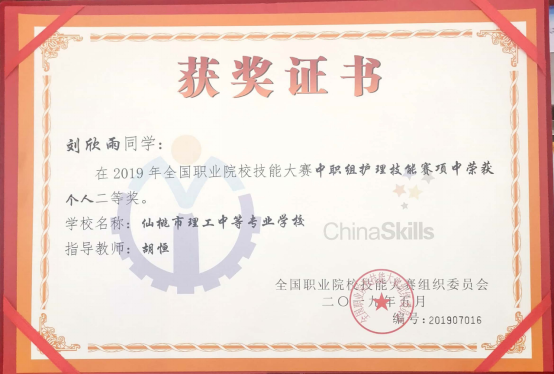 6月14日,在2019年全国职业院校技能大赛中职组护理赛项中,理工中专两名选手刘欣雨、李化雨代表湖北省双双获全国二等奖,这也是湖北省获得的仅有最好奖项。