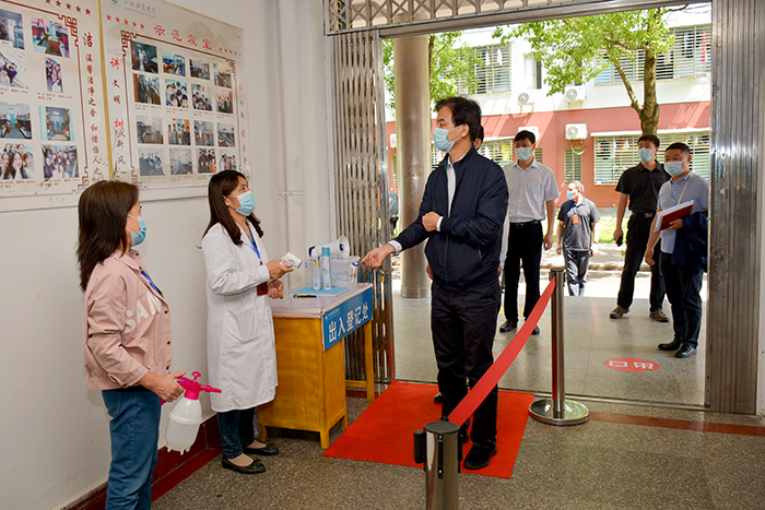 联络组实地检查了测温流程、教学编排、食堂防控、宿舍管理和防疫物资储备等工作,详细询问了教职工核酸检测、早午晚体温测量、医护力量配备、应急处置及学生毕业工作安排、就业指导服务等方面的情况。