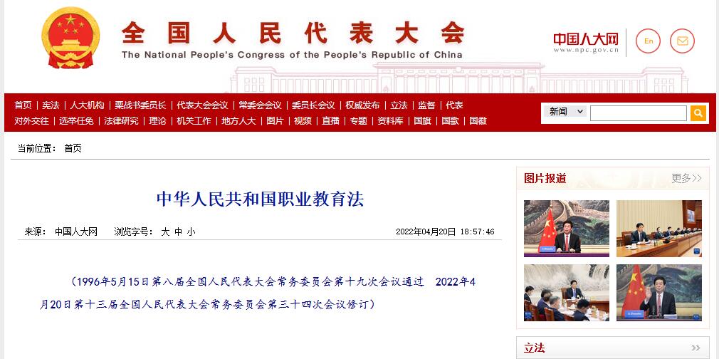 十三届全国人大常委会第三十四次会议4月20日表决通过新修订的职业教育法,2022年5月1日起施行。