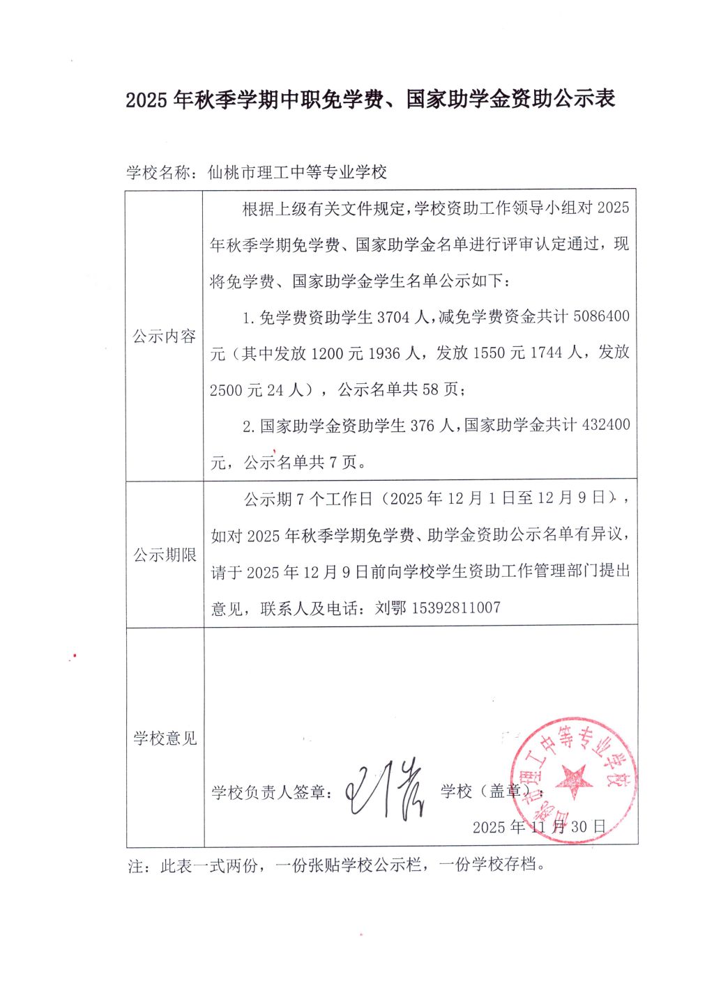 附件2:2025年秋季学期仙桃市理工中等专业学校国家助学金学生名单.xlsx