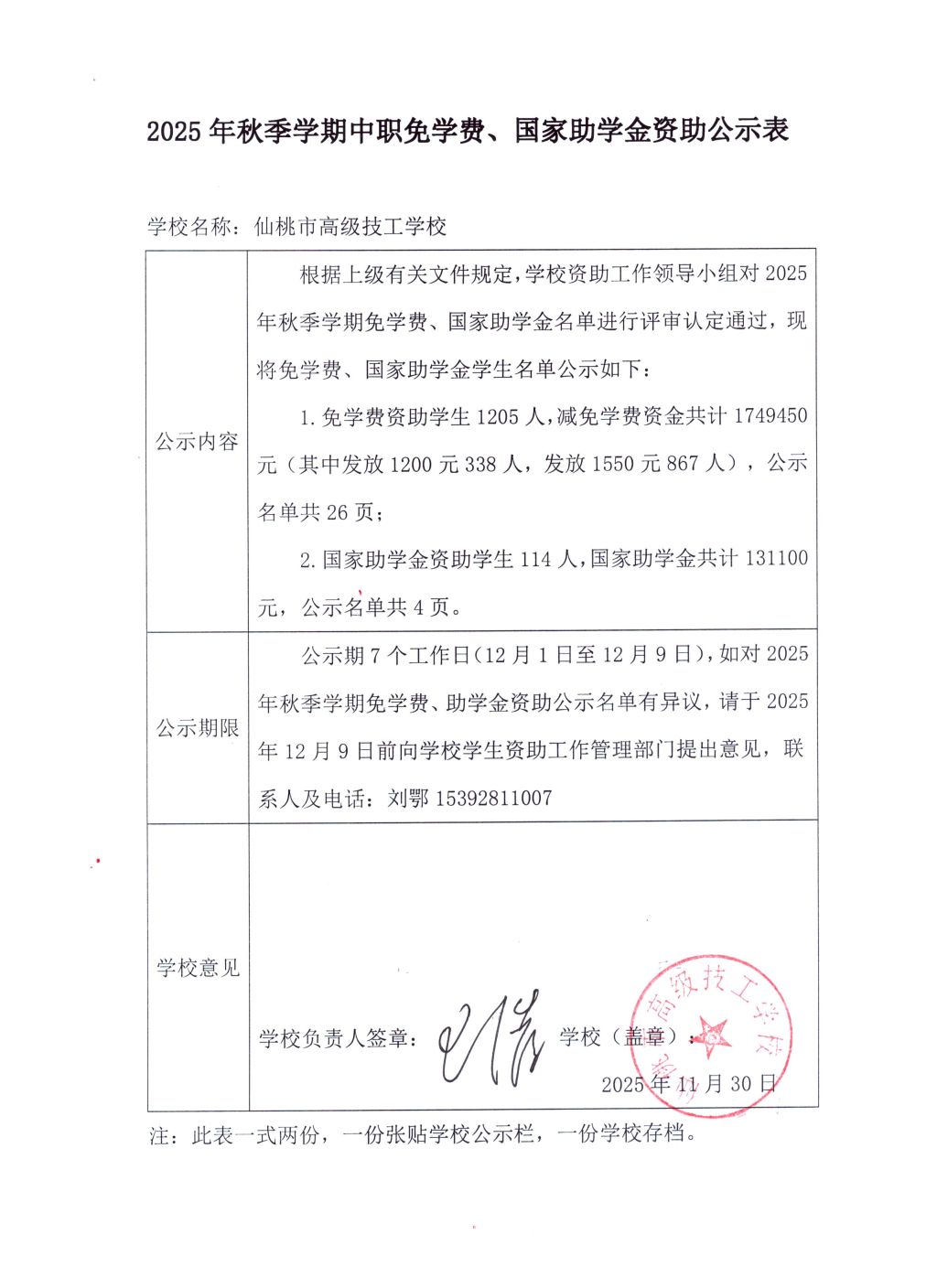 附件1:2025年秋季学期仙桃市高级技工学校国家助学金学生名单.xlsx